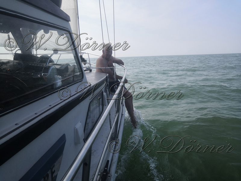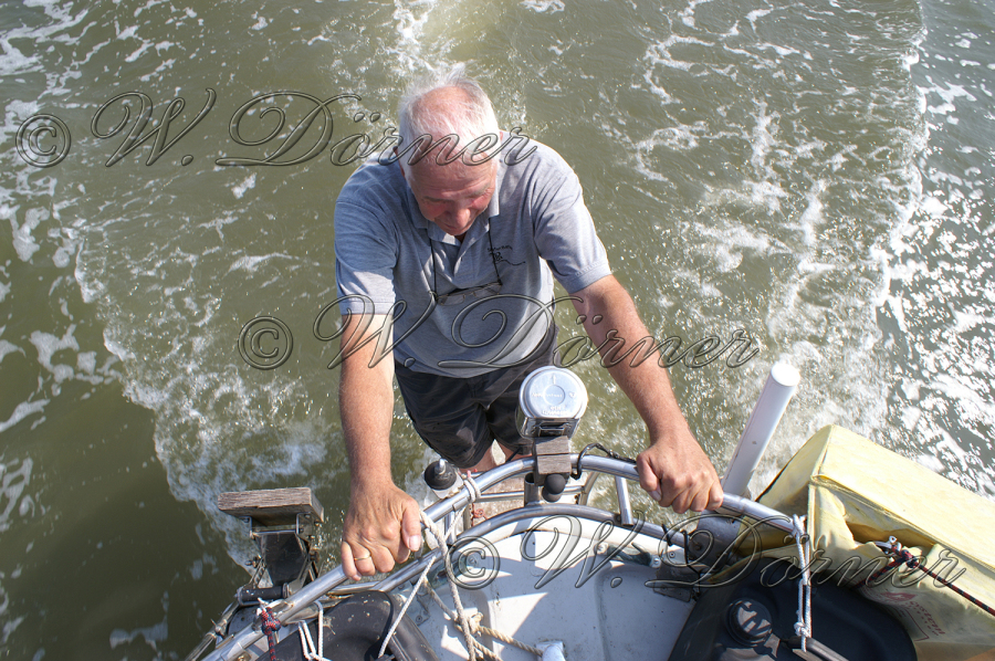 12:00 Uhr UTC setzten wir bei Wind E 3-4 Bft die Genua und fuhren mit Motor gegen die Strömung die Weser abwärts. Die Sonne knallte und Stefan versuchte sich am Heck etwas