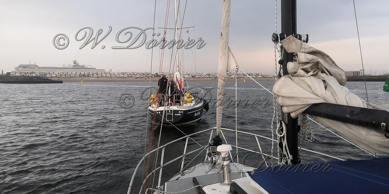Ich entschied nach Ijmuiden zurück zu segeln und setzte das Großsegel, Motor geht ja nicht mehr an, und nahm Kurs auf das Ufer. Es lief noch recht gut, hatten aber die Strömung gegen uns. Bei unserem Kurs dicht unter Land nach Norden hatten wir weniger Strom gegenan. Die Einfahrt von Ijmuiden ist groß und breit, da kommen wir immer rein. Für die ca. 6,5Sm bis zur Hafeneinfahrt brauchten wir 2,5 Stunden da wir nur 2,5 – 3 Kn über Grund segelten. Im Hafen angekommen schleppte uns ein Segler bis zum Yachthafen. Da machten wir um 19:00 Uhr UTC fest. Die Bilge stand wieder bis zum Motor voll Wasser mit Öl oder Diesel Gemisch. Wir konnten sie an der Tankstelle abpumpen.