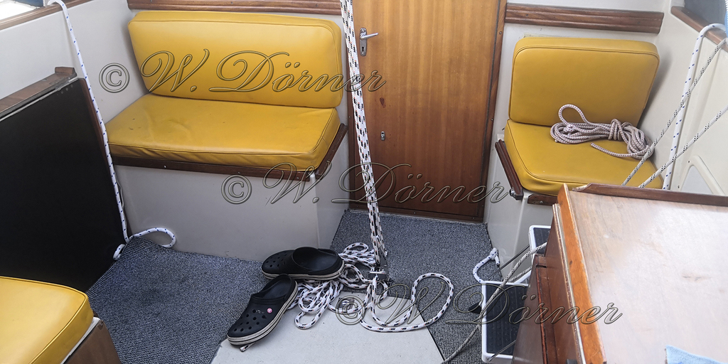 Großsegel ist recht umständlich zu setzen da man dafür auf das Kajütdach muss um an den Großbaum zu kommen. Das Dach ist aus Stoff und nicht belastbar.