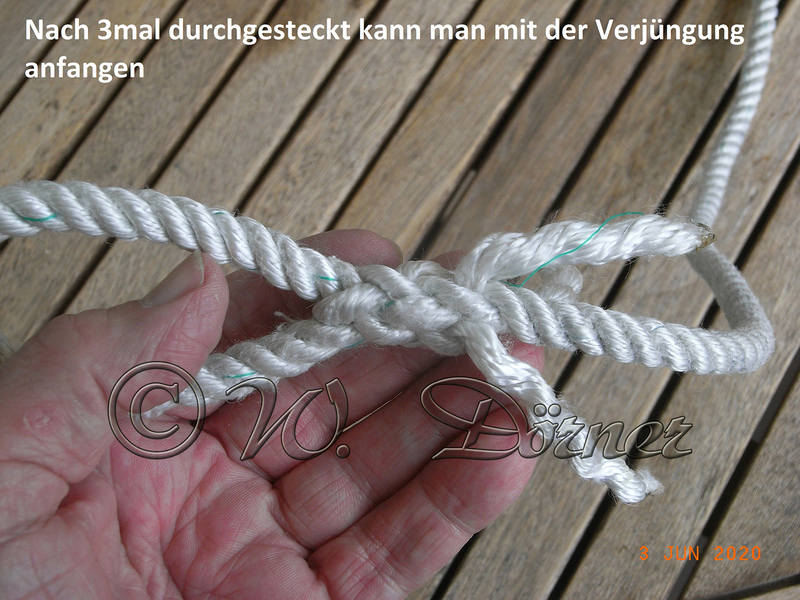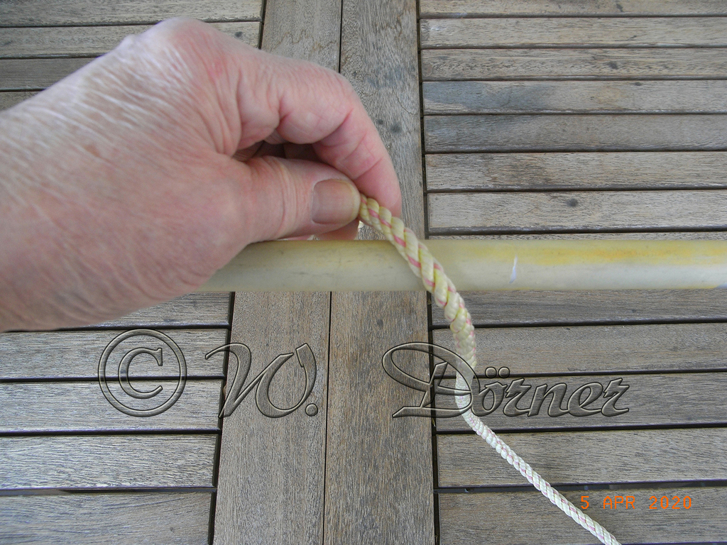 Der Webeleinstek eignet sich zum schnellen festmachen, wobei die Länge schnell und einfach verändert werden kann. Er eignet sich z. B. zur Befestigung von Fendern an der Reling. Er hält solange Zug drauf ist. Webeleinstek gesteckt.