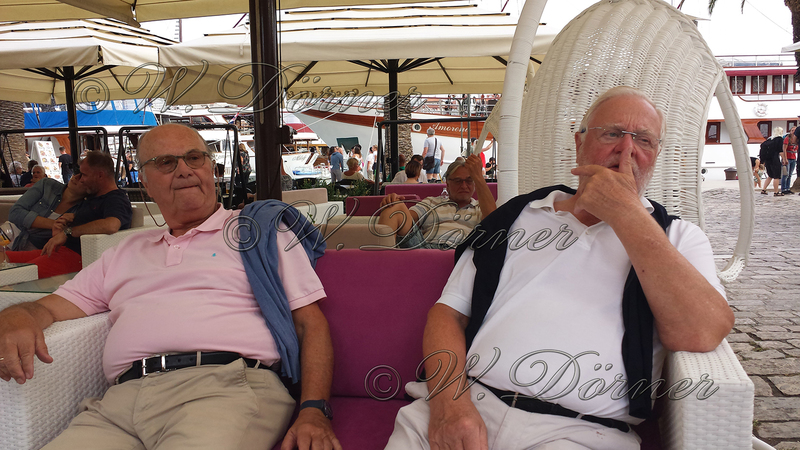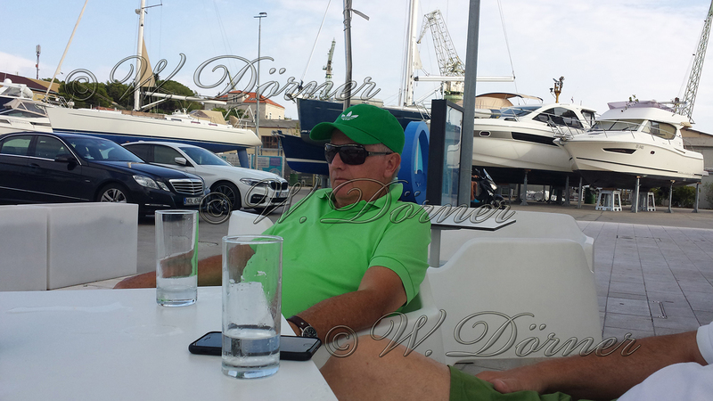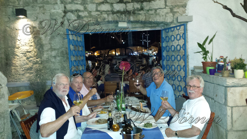Ich Wieland bin erst am Samstag den 2.9. mit dem Flieger in Luka Split gelandet. Meine Mannschaft war schon einige Tage vorher angereist. Jetzt musste ich Dietmar, Jürgen, Klaus und Walter nur noch finden. Also zu Fuß durch die Altstadt und zum Hafen. Am frühen Nachmittag war dann auch die Übergabe der 52 Fuß Segelyacht „KRISTINA II“ . Damit wir nicht den langen Weg zum Restaurant laufen mussten fuhr uns der Verscharterer mit dem Beiboot in die gegenüberliegende Altstadt. Nach dem Essen hatten wir dann leider kein Wassertaxi mehr. Also zu Fuß.