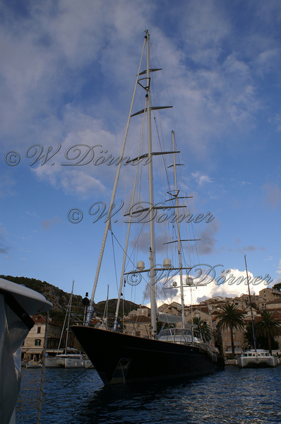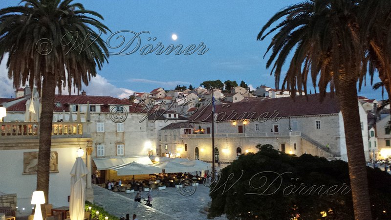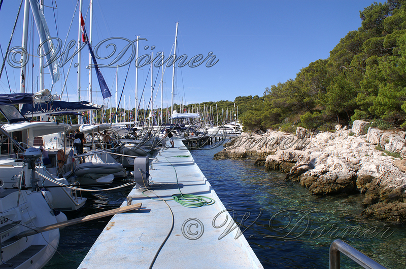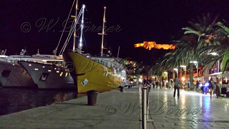 Am Sonntag war das Wetter nicht so schön wie erwartet. Wind aus West mit 3-4 Bft und Nieselregen. Das Boot war jetzt eingeräumt und die wenigen Lebensmittel hatten wir auch schon Samstag gebunkert. Wir setzten das Großsegel und nahmen die Maschine dazu. Unser Ziel sollte die Insel Hvar sein. Um 12:30 Uhr passierten wir die Insel Solta. Der Hafen in der Altstadt Hvar war besetzt und wir mussten in die ACI Marina auf der kleinen südlich gelegenen Insel Paklinski Stoci ausweichen. Der künstlich angelegte Hafen war proppe voll und der Hafenmeister nicht besonders freundlich. Hier war nichts außer Wald, aber es gab ein Wassertaxi zur Insel Hvar. Mit dem Schnellboot fuhren wir in die Stadt zum Essen. In der Nacht ging es dann auch wieder zurück.