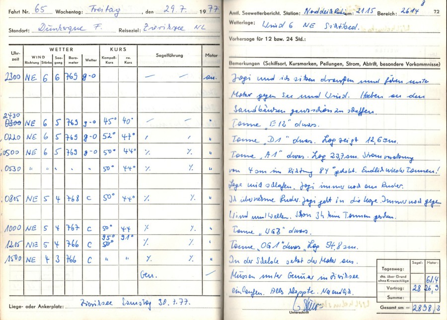 Freitag, Ostende den 08.07 1977 1215 Uhr Wind N 5 Bft. Unser Ziel soll Dover sein.