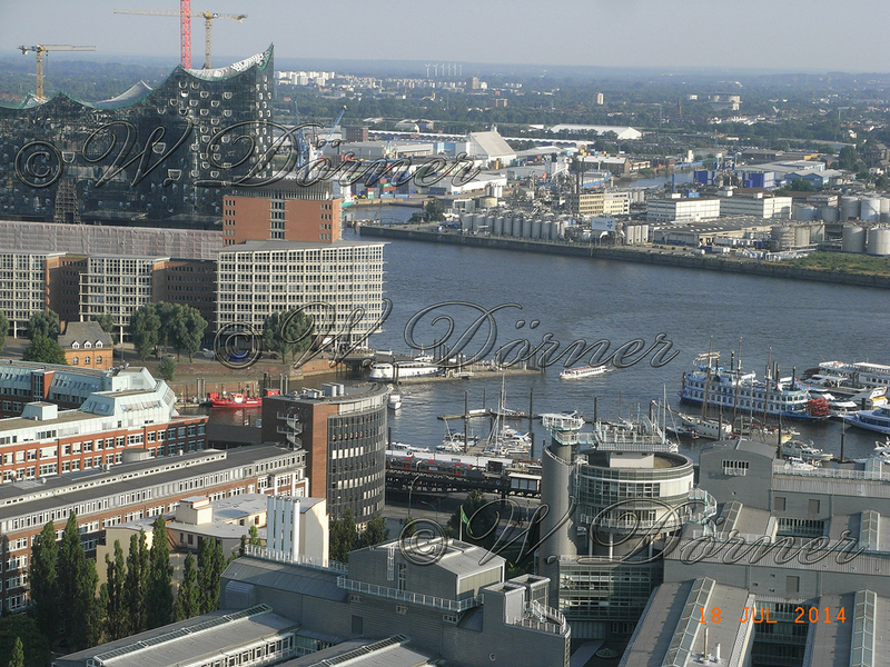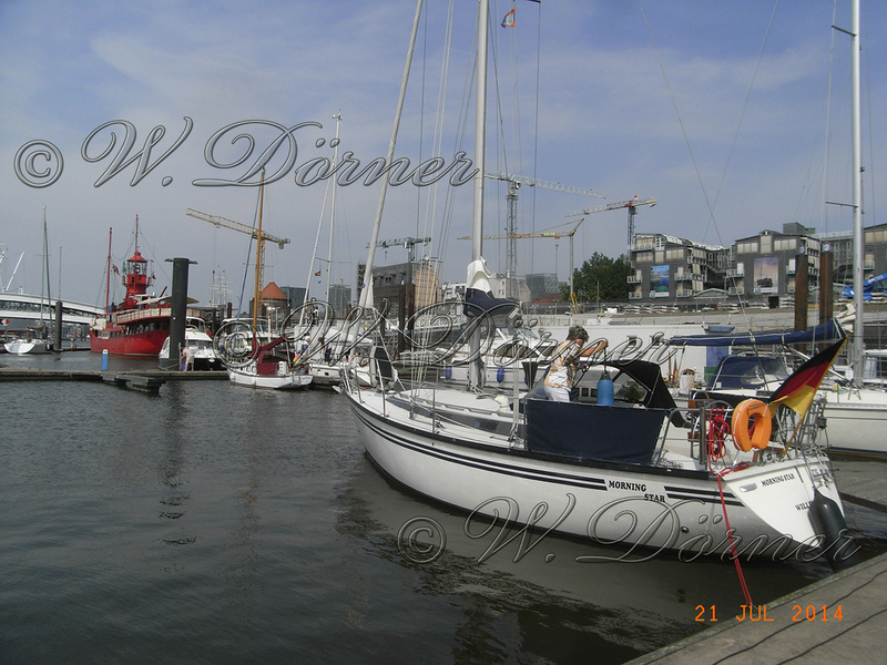 Sonntag fahren wir dann unter Motor mit dem Strom teilw. Mit 12Kn ü.G. nach Hamburg und machen im City Hafen um 18:00 Uhr fest. Auf der Elbe in Richtung Hamburg überholt uns ein Containerschiff mit 10.000 Container an Bord. Er läuft mit ca. 9 - 10 Kn immerhin ca. 2 Kn schneller als wir an uns vorbei und macht dabei keine Wellen. Später werden wir auch noch von einem Schwerlastkrahn überholt.